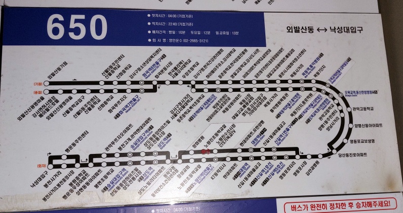 * 첫, 막차 : 외발산동 차고지(신광명마을) 04시 00분 / 22시 40분 - 낙성대입구 05시 00분 / 23시 50분