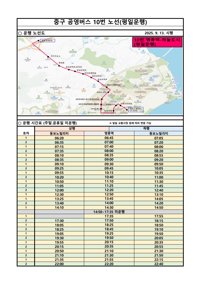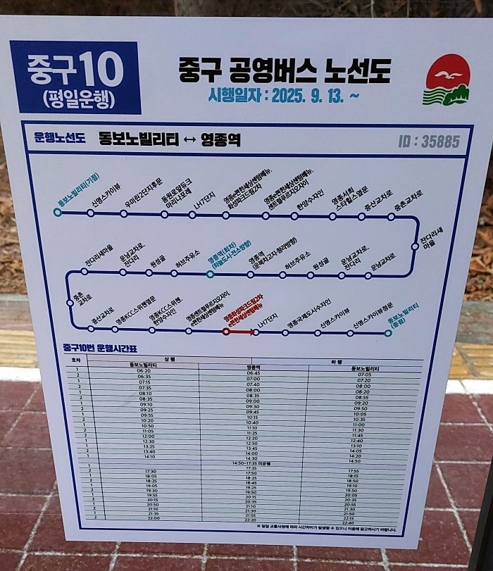 인천 영종 동보노빌리티아파트(출발/도착지점) - 영종 신명스카이뷰 주얼리아파트 - 하늘도시 우미린 2단지 후문. 영종 신명스카이뷰 입구 - 영종국제도시 동원로얄듀크마리나포레 - 영종 LH 7단지 - 영종국제도시 화성파크드림 2차. 이-편한세상 영종국제도시 센텀베뉴 아파트 - 영종 센트럴푸르지오 자이아파트. 이-편한세상 영종국제도시 센텀베뉴 아파트. 인천 별빛초 - 인천 영종한양수자인 앞. 영종하늘도시 KCC 스위첸 입구 - 중산교차로 - 중촌교차로 - 잔다리 새마을 - 운남교차로 동측 - 운남교차로 서측 - 원성골 - 허브제1주유소 - [동강1교] - 영종역 1번출구(승차 : 1번출구 건너편 정류장 / 하차 : 1번출구 앞 정류장) (공항철도) (회차지점)